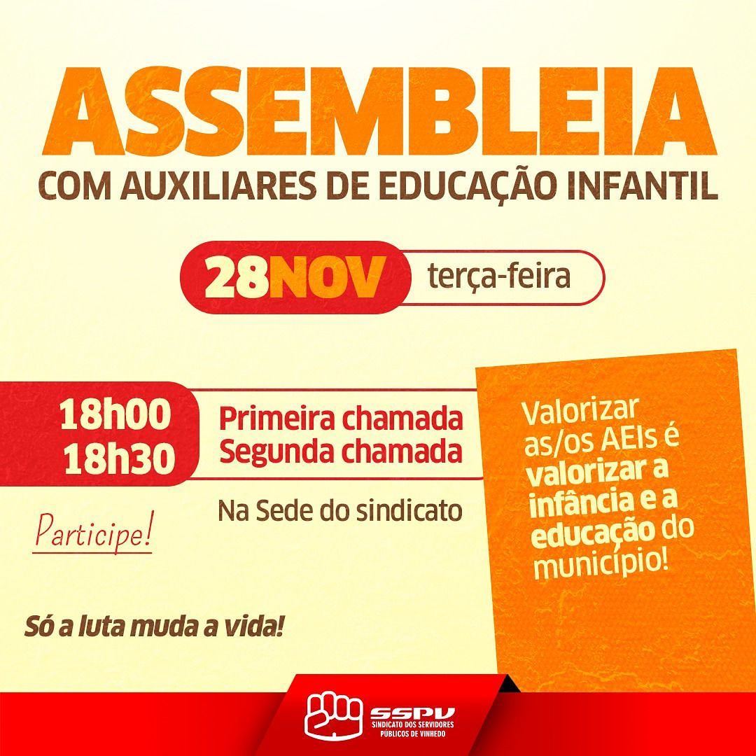O Sindicato dos Servidores Públicos de Vinhedo, à pedido de representantes da categoria, fará uma assembleia no dia 28 de novembro (terça-feira). Primeira chamada às 18h e segunda chamada às 18h30 na sede do sindicato. Precisamos nos organizar para que haja valorização da profissão. Contamos com todas e todos.