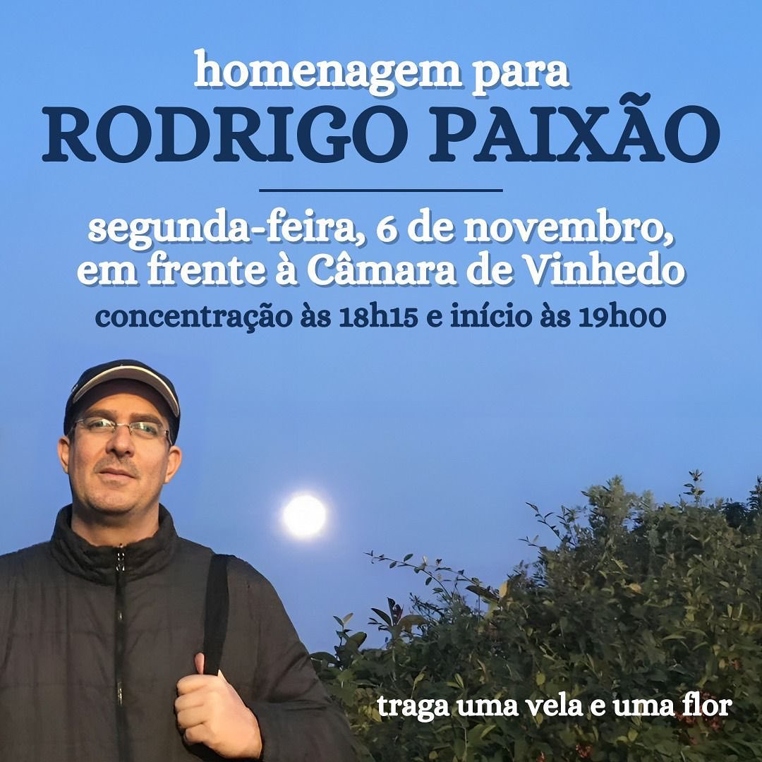 Nosso amigo Rodrigo sempre foi humilde e, mesmo sendo uma figura pública, nunca quis exposição. Para evitar o sofrimento da sua família e de seus amigos, escolheu ser velado no Cemitério de Montjuïc, em Barcelona, onde finalizou seu tratamento.Com consentimento da família do Rodrigo, os mandatos dos vereadores Nayla e Luiz estão organizando uma homenagem em agradecimento ao seu legado. Vamos nos reunir na Avenida 2 de Abril, em frente à Câmara de Vinhedo, nesta segunda-feira (06/11/23). Concentração às 18h15 e início às 19h00. Se possível, leve uma vela e uma flor.