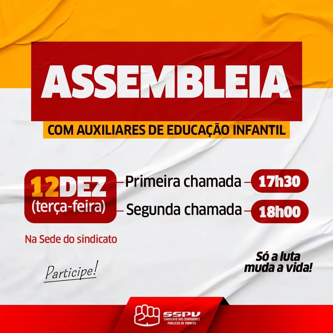 Convocamos todas as servidoras e todos os servidores de Vinhedo que exercem a função de Auxiliar de Educação Infantil para a próxima Assembleia Geral Extraordinária.