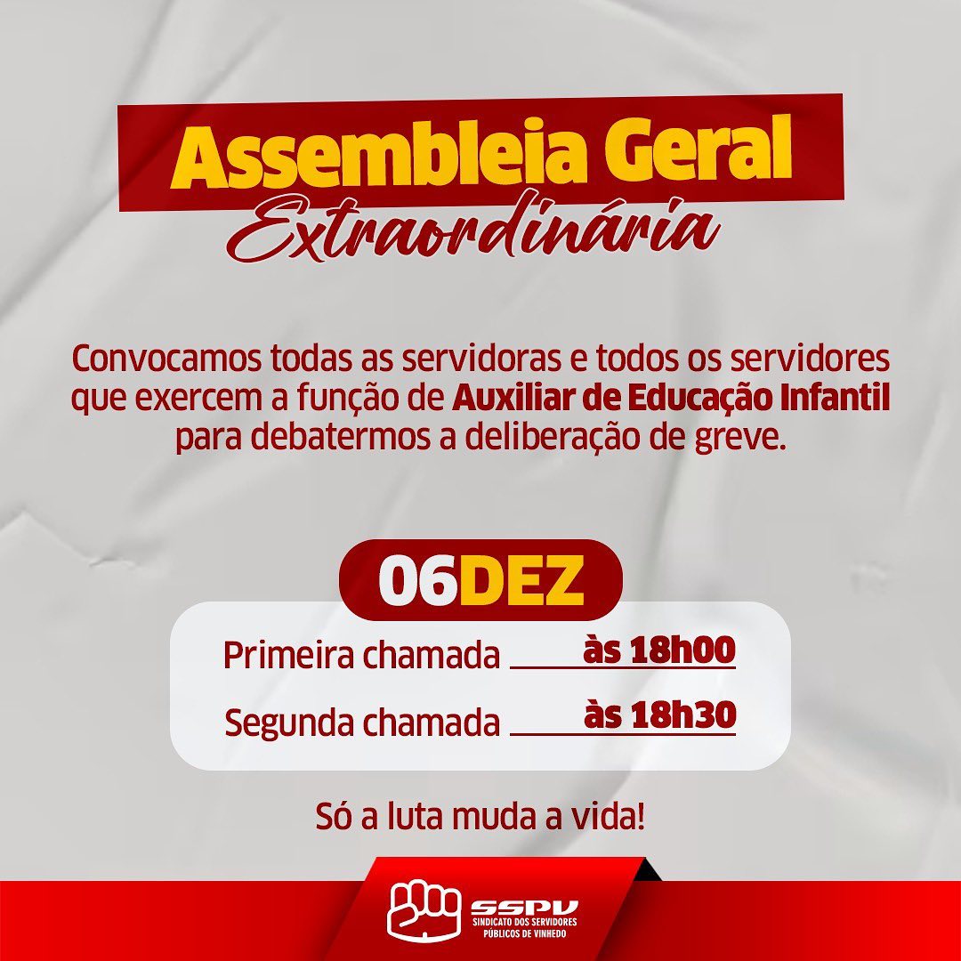 Convocamos todas as servidoras e todos os servidores de Vinhedo que exercem a função de Auxiliar de Educação Infantil para Assembleia Geral Extraordinária para deflagração de greve.