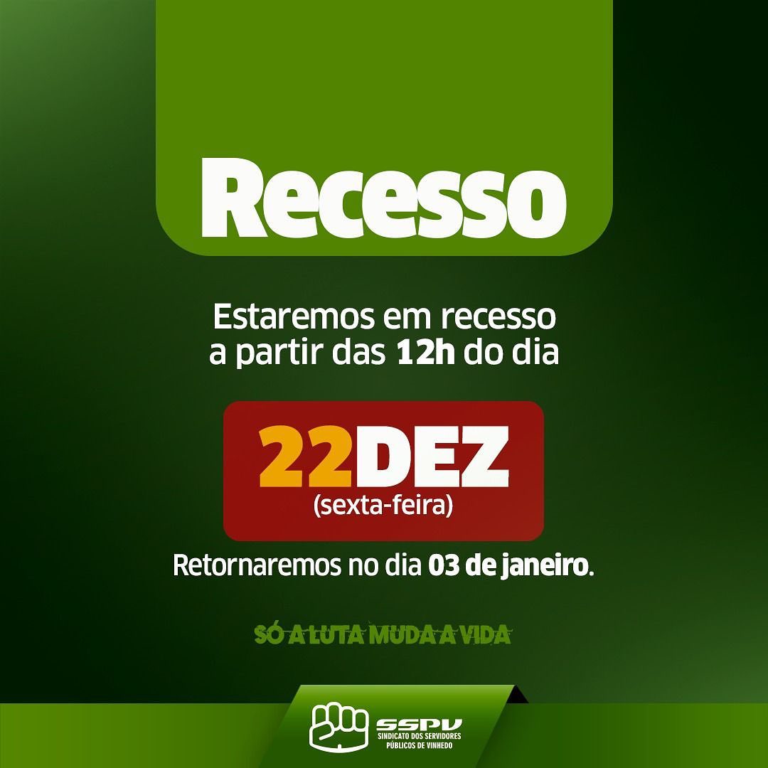 Categorias Publicação O SSPV estará de recesso a partir de 22 de dezembro. Retornamos em 3 de janeiro. Desejamos um excelente fim de ano a todos. Autor do post Por SSPV Data de publicação 21 de dezembro de 2023 Nenhum comentário em O SSPV estará de recesso a partir de 22 de dezembro. Retornamos em 3 de janeiro. Desejamos um excelente fim de ano a todos. ← AUXILIARES DA EDUCAÇÃO INFANTIL CONQUISTAM UM GRANDE AVANÇO → Desejamos a todas as servidoras e os servidores um FELIZ NATAL! Que seja um momento de união, felicidade e celebração ao lado de amigos e familiares. Só a luta muda a vida! Deixe um comentário Cancelar respostaO seu endereço de e-mail não será publicado. Campos obrigatórios são marcados com *Comentário * Nome * E-mail * Site Salvar meus dados neste navegador para a próxima vez que eu comentar.