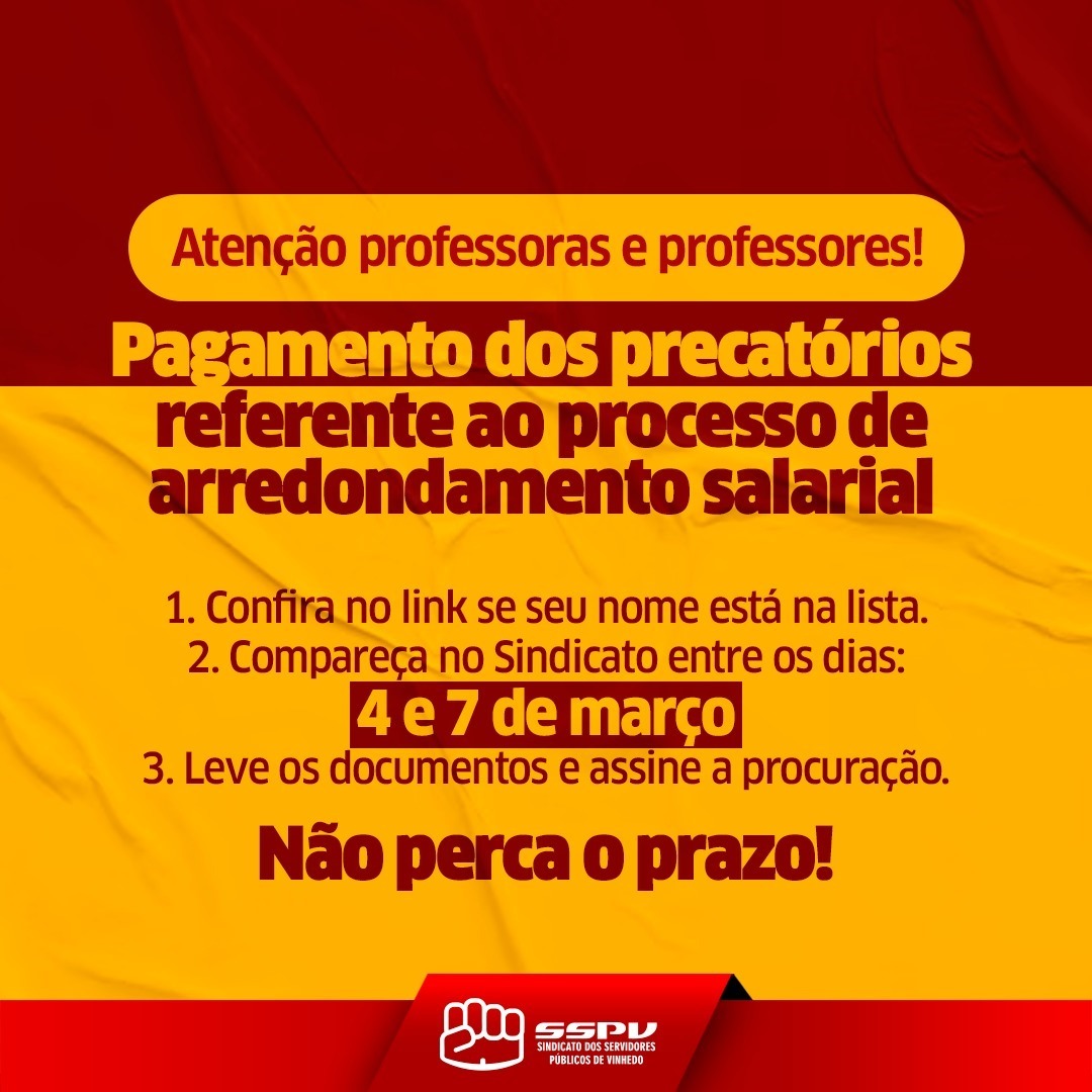 Com isso, as professoras e os professores listados devem comparecer no sindicato entre segunda-feira (04/03) até quinta-feira (07/03) para assinar procuração e informar os seguintes dados: