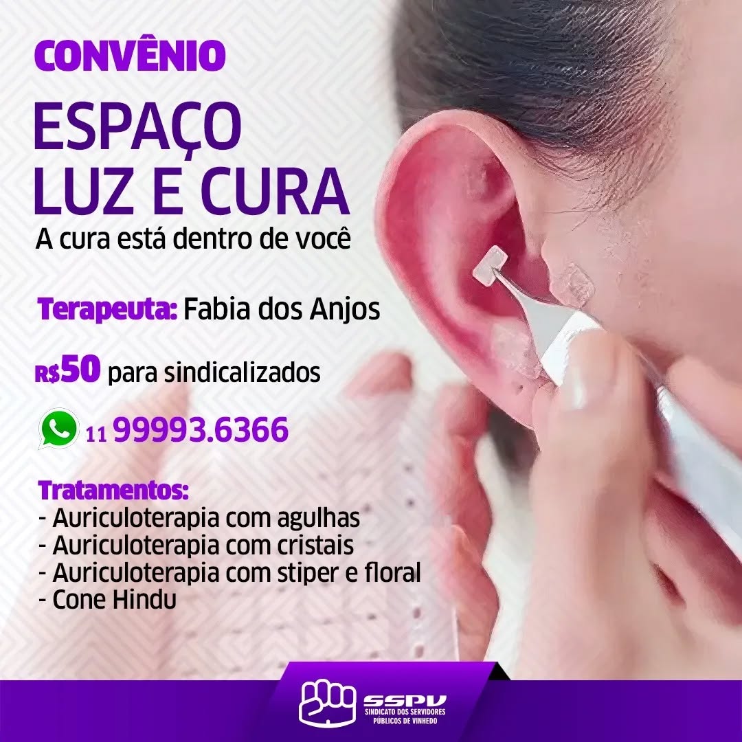 Agora, temos convênio com o Espaço Luz e Cura. Quem é sindicalizado realiza uma série de tratamentos auriculares por apenas R$50 a sessão. Para mais informações, entre em contato com Fabia pelo celular 11 99993-6366