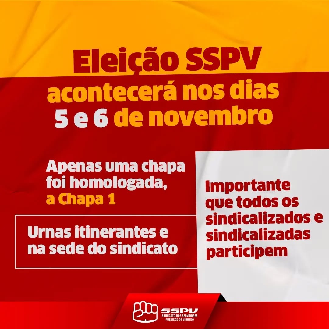 O Sindicato dos Trabalhadores no Serviço Público Municipal de Vinhedo informa que, depois do processo de inscrição das chapas para eleição do sindicato, houve a inscrição de apenas uma chapa para o processo eleitoral. As eleições foram convocadas e todos os prazos seguem o disposto no Estatuto da Entidade Sindical.