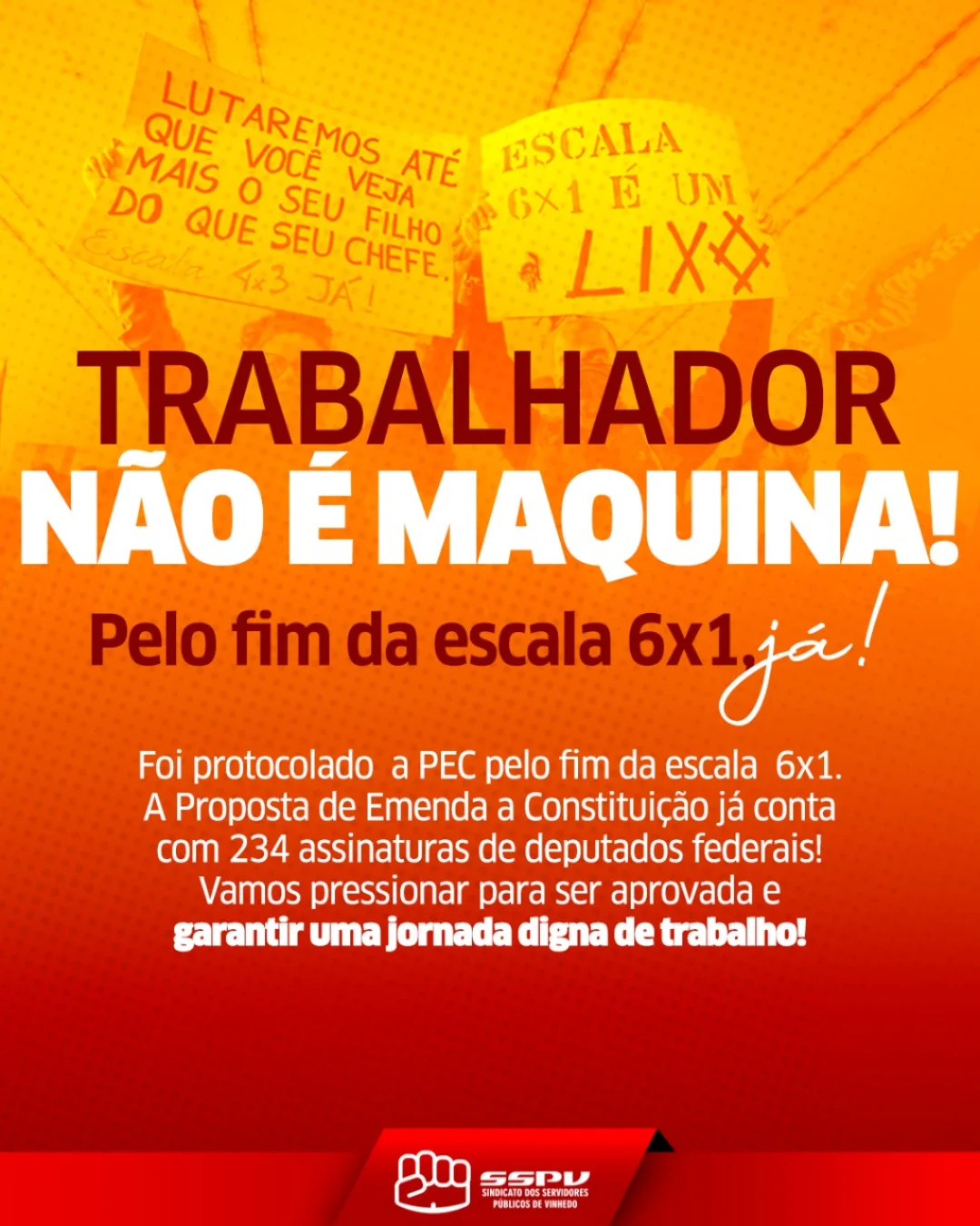 Nesta terça-feira (25/02), foi protocolada na Câmara dos Deputados a PEC que visa acabar com a escala 6×1, pela deputada Erika Hilton (PSOL-SP) ,Movimento VAT (Vida Além do Trabalho) e por um conjunto de deputados que apoiam a luta pelo fim das jornadas abusivas. O texto conta com a assinatura de 234 deputados, sendo que o necessário para o protocolamento era de apenas 171, mostrando que a mobilização popular e organização da luta tem surtido efeito, pressionar e influenciar as decisões dos deputados é necessário.
