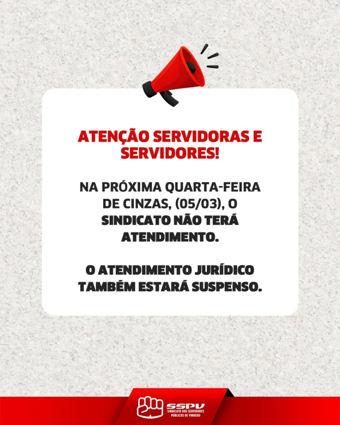 Informamos que, na próxima quarta-feira de cinzas, (05/03), o Sindicato não estará em funcionamento, seguindo o Decreto nº 70 de 27 de fevereiro de 2025. Além disso, não haverá atendimento jurídico neste dia.