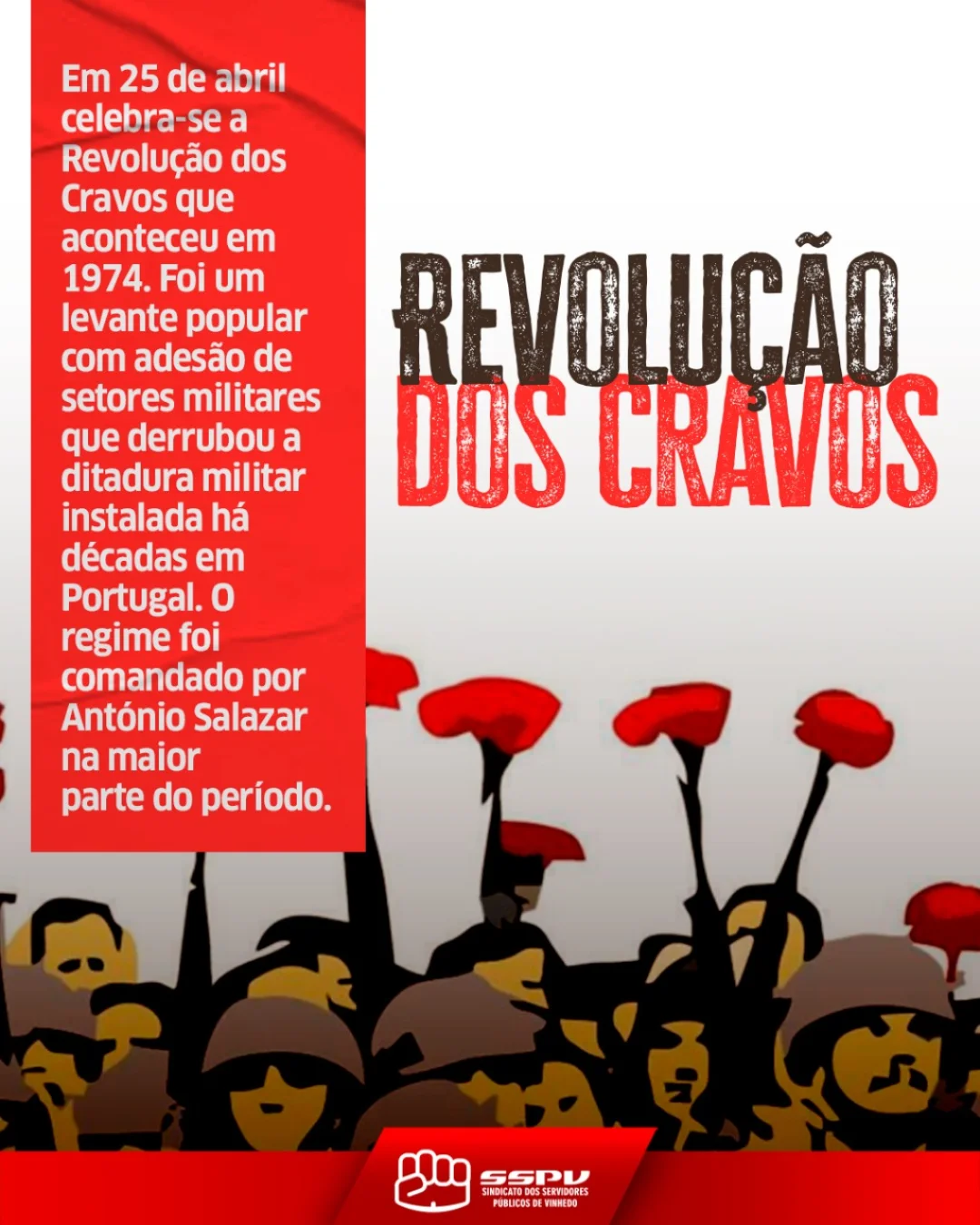 Sofrendo com as duras medidas, a população portuguesa se organizou em uma série de lutas “pacíficas”. Essas manifestações foram violentamente reprimidas pelo regime, resultando na morte de quatro pessoas e ferindo dezenas. Os principais marcos revolucionários se firmaram na distribuição dos cravos aos soldados e na adesão de parte dos militares ao movimento antifascista!