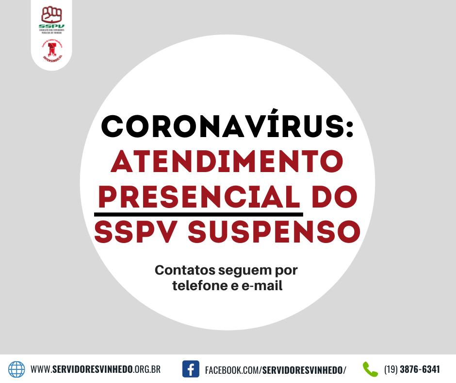 A diretoria do SSPV também vai seguir as orientações da prefeitura e demais autoridades. A partir de amanhã (18/03), estará suspenso o ATENDIMENTO PRESENCIAL. O atendimento será concentrado por TELEFONE e E-MAIL, incluindo assessoria jurídica. Fale conosco pelos números (19) 3876-6341 e (19) 99696-3631; ou pelo e-mail servidoresvinhedo@uol.com.br.