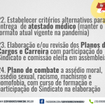 Os estudos econômicos do Sindicato provam que há espaço fiscal para a valorizar o servidor. O trabalho incansável durante a pandemia deixa explícito como o funcionalismo precisa ser reconhecido. Um primeiro passo é acabar com o calote do biênio e do quinquênio. E o segundo passo é preparar um aumento real para janeiro de 2022, quando o congelamento de salários se encerra. E, para agora, com urgência, reforçar as medidas de prevenção à Covid-19.