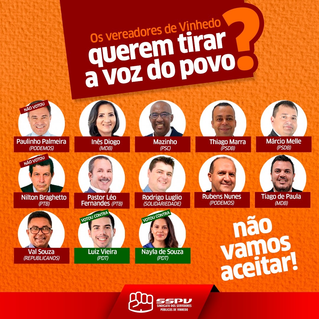 Todos os outros vereadores e vereadora vergonhosamente não compareceram à reunião, sequer justificaram a ausência, mostrando a falta de compromisso com a servidora e o servidor de Vinhedo e com parte da base eleitoral. Três desses vereadores são servidores públicos e também serão beneficiados pelo reajuste e ainda assim não demonstraram interesse. Mas depois sobem na tribuna com discurso de apoio. Basta de discursos vazios!