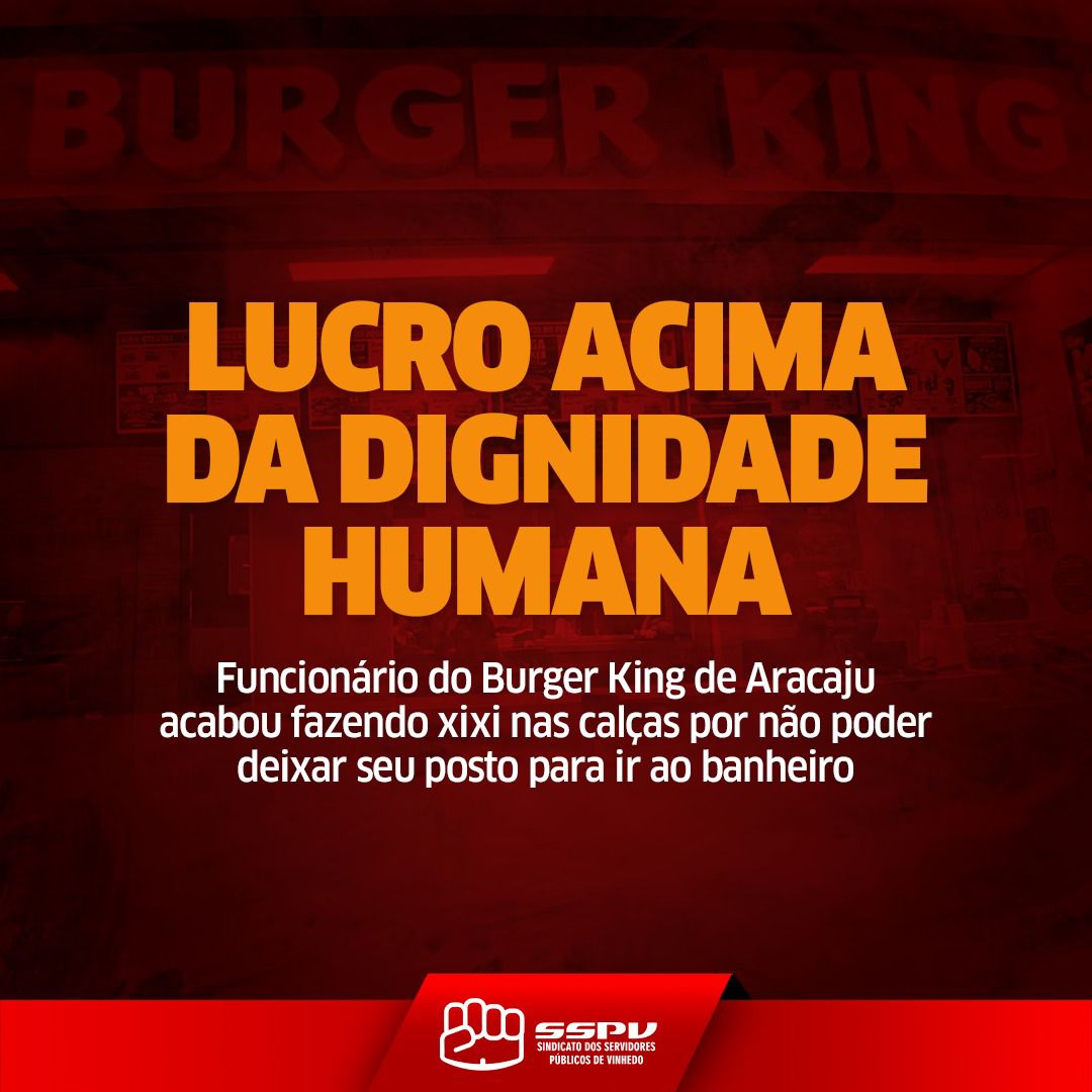 O funcionário de uma loja do Burger King em Aracaju acabou fazendo xixi nas calças para não tomar uma advertência por IR AO BANHEIRO. Isso mesmo! E no dia anterior já havia sido advertido POR SAIR DO POSTO DE TRABALHO NO HORÁRIO CORRETO!