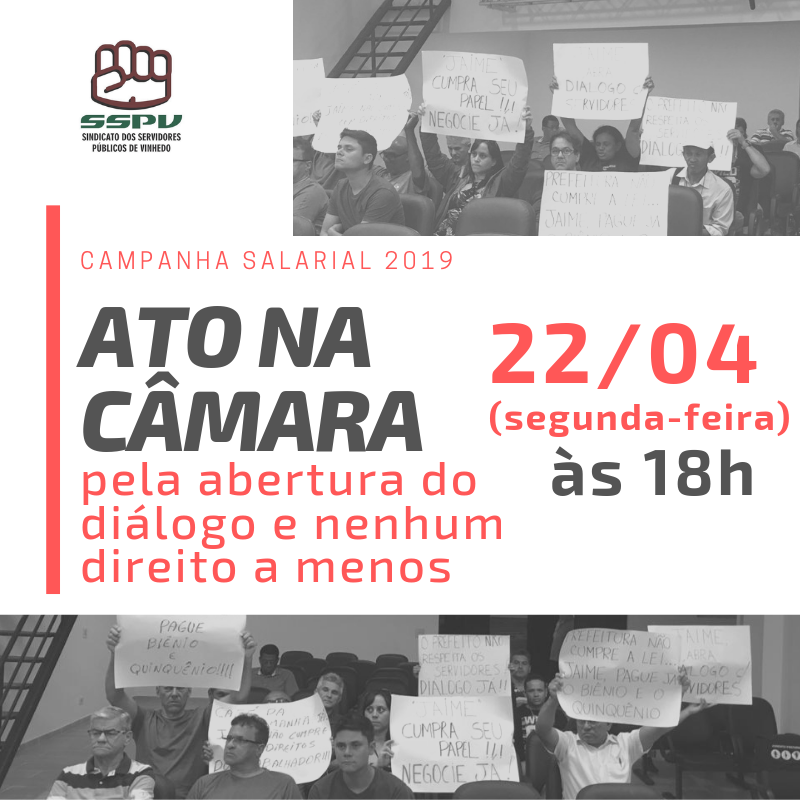 Começou a Campanha Salarial 2019 dos servidores de Vinhe­do. A pauta de reivindicação foi aprovada, em Assembleia Geral, no dia 21 de fevereiro e logo protocolada junto ao governo municipal. Até o fechamento deste jornal (18/03), no entanto, a prefeitura não deu qualquer retorno para iniciar a negociação.